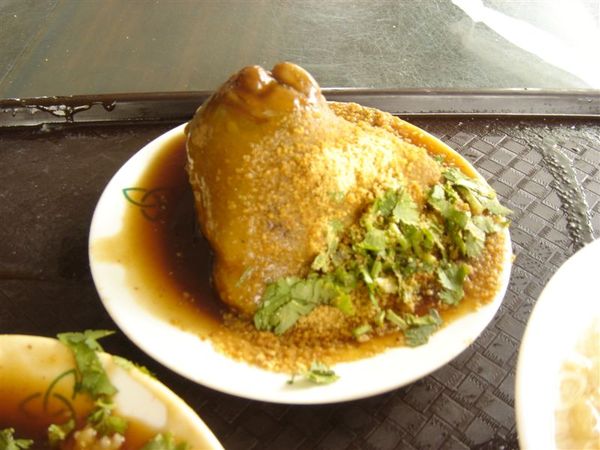 點了鱔魚炒麵和棺材板各一份,台南鱔魚炒麵醬汁芶芡的口感略比北部甜一些,有點吃不習慣